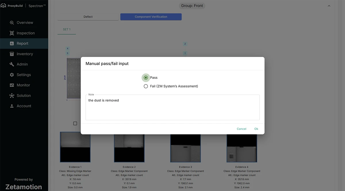 Zetamotion inspection dashboard showing defect detection results with a close-up of the inspection hardware and scanned material sample.